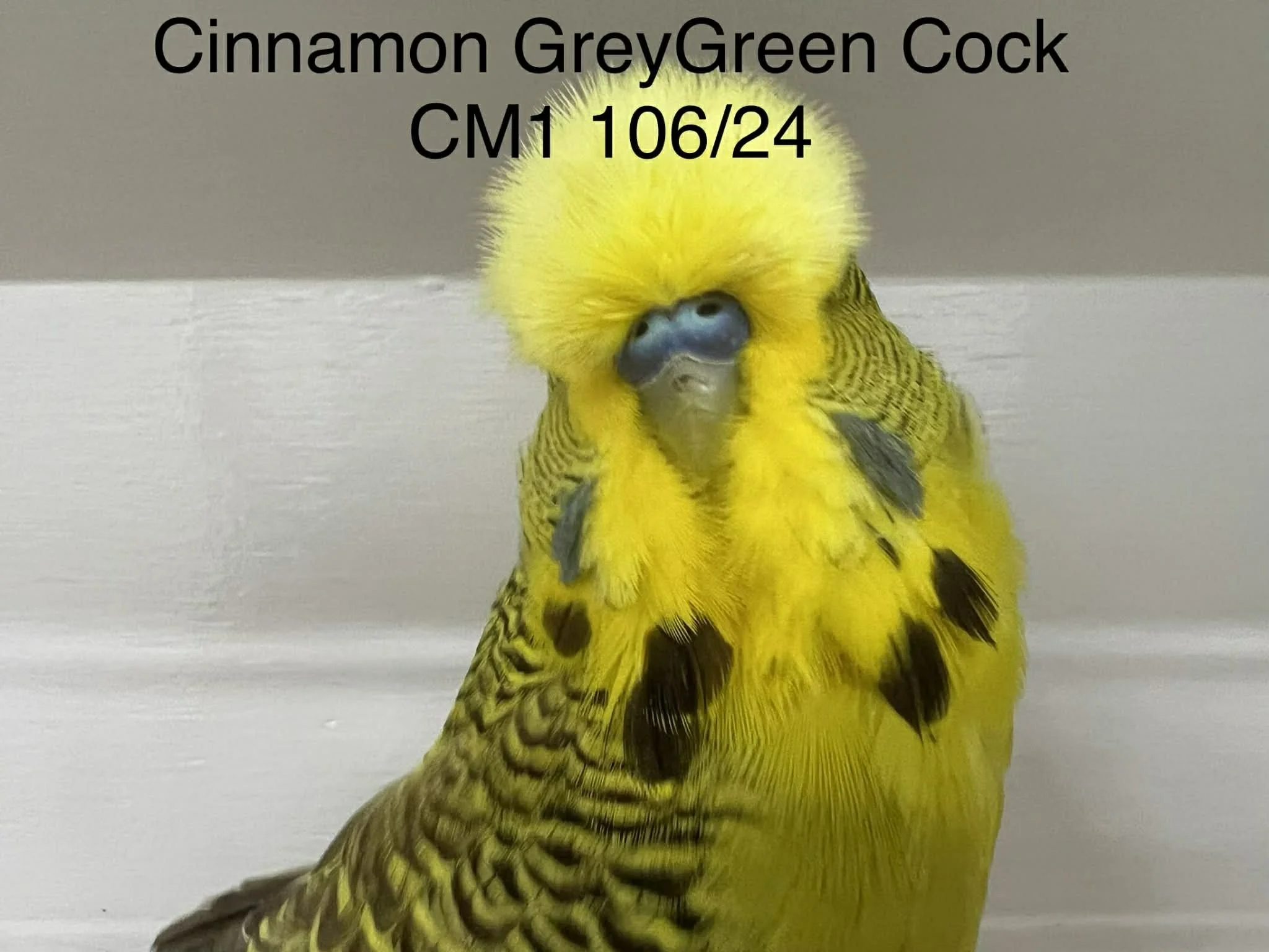 Grey green cock with good spots and mask. Clean cap and deportment. Finishing off his moult.